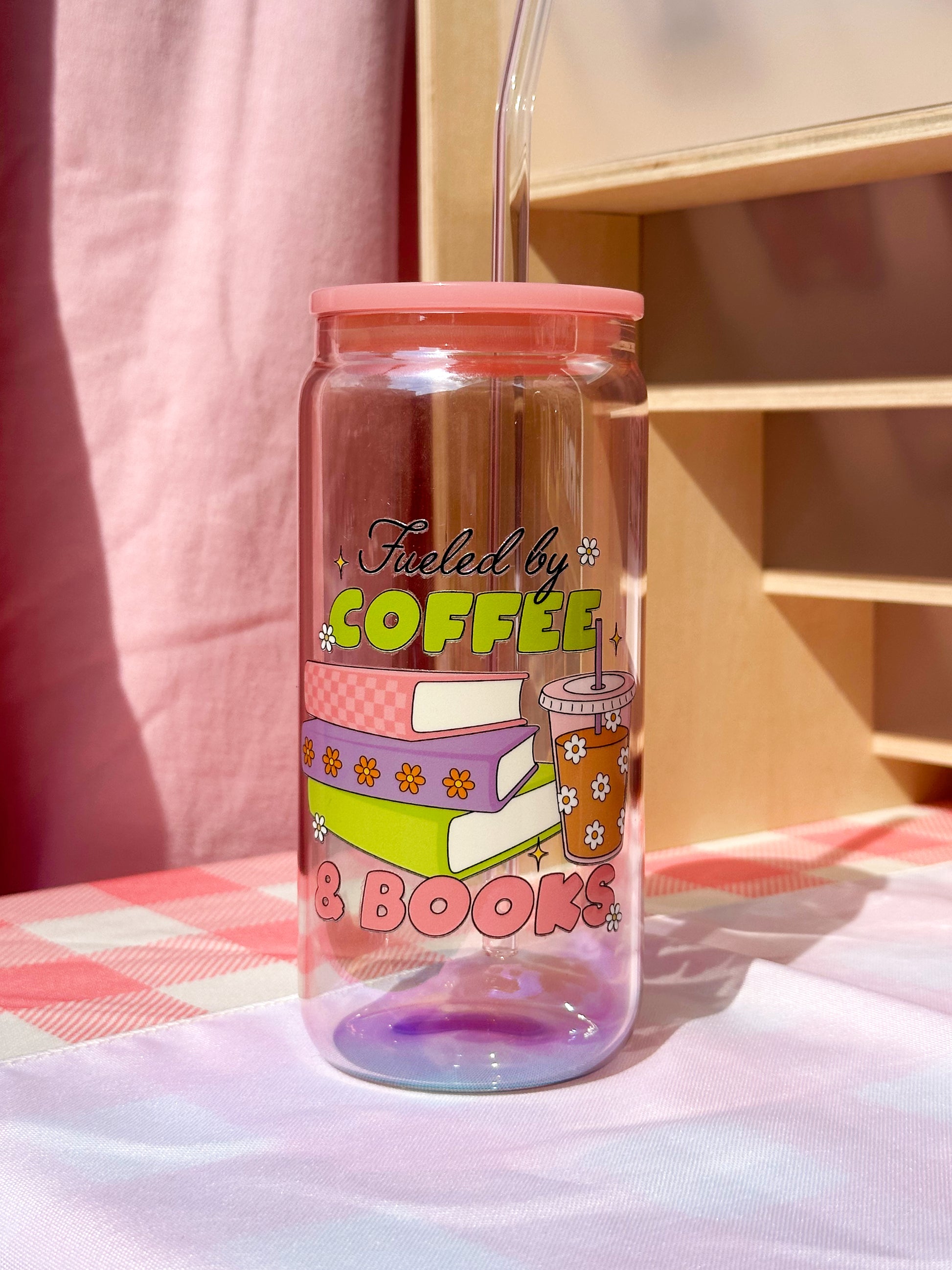 ‘Fueled By Coffee and Books’ Pink Holographic Glass Cup